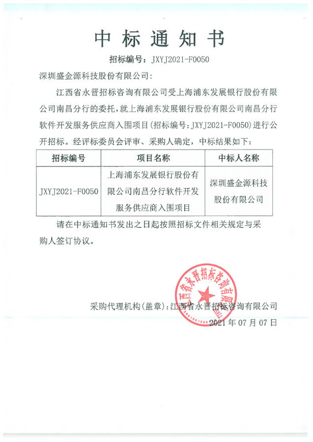 2021年7月流火淬金,深圳盛金源股份有限公司成功中标“上海浦发银行南昌分行软件开发服务采购项目入围、及业务类机具投标人入围”,顺利成为此两个项目的供应商。