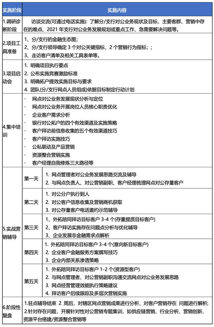 采取“2+1+5+1”的辅导模式,即调研诊断2天,培1天,辅导5天,复盘总结1天,具体项目流程与项目内容见下表